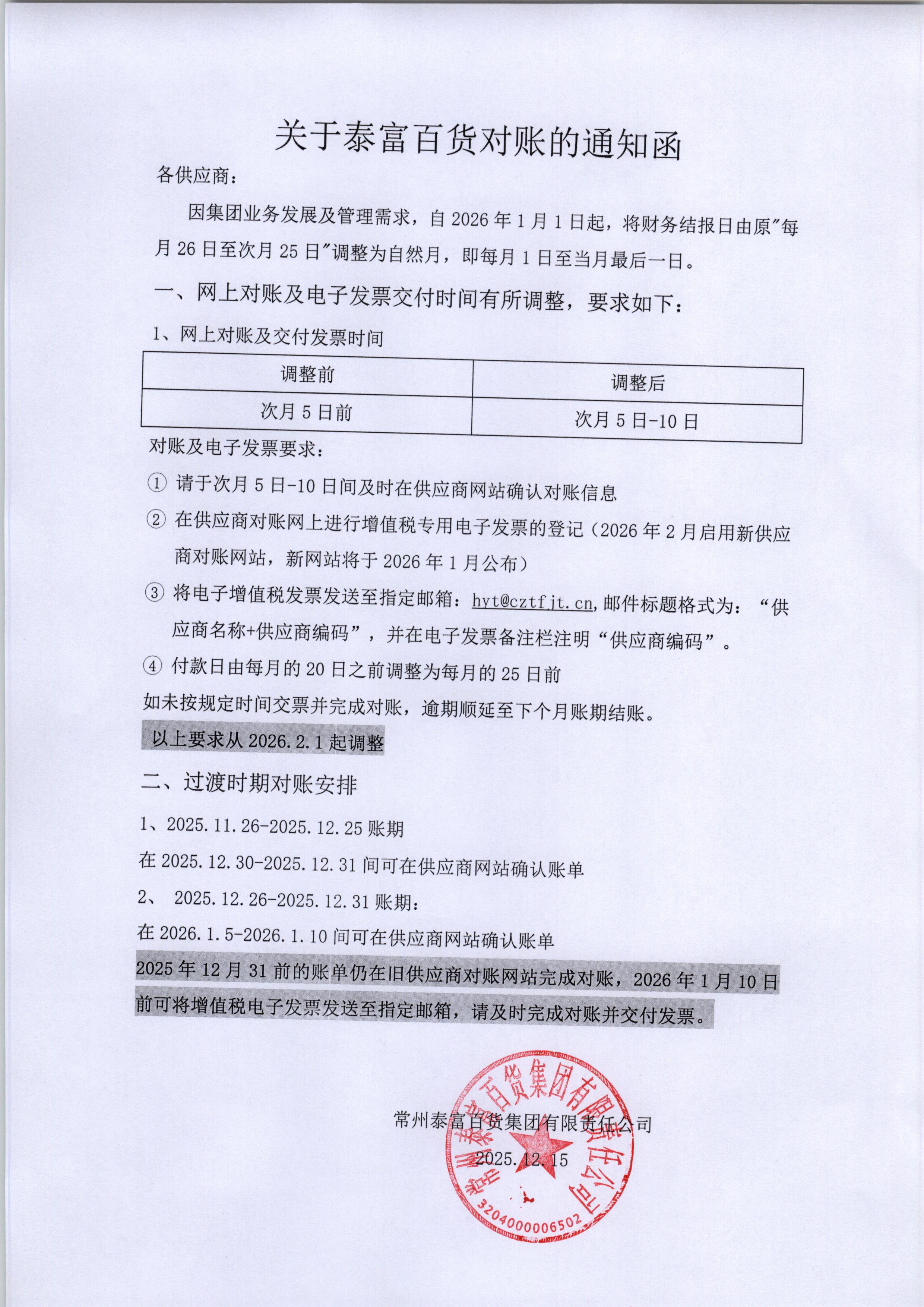 2025年12月31前的账单仍在旧供应商对账网站完成对账,2026年1月10日前可将增值税电子发票发送至指定邮箱,请及时完成对账并交付发票。